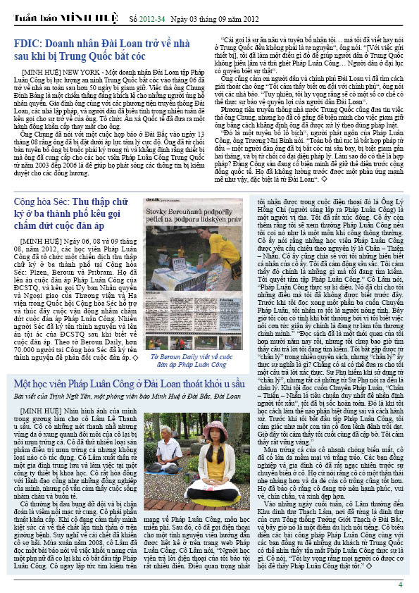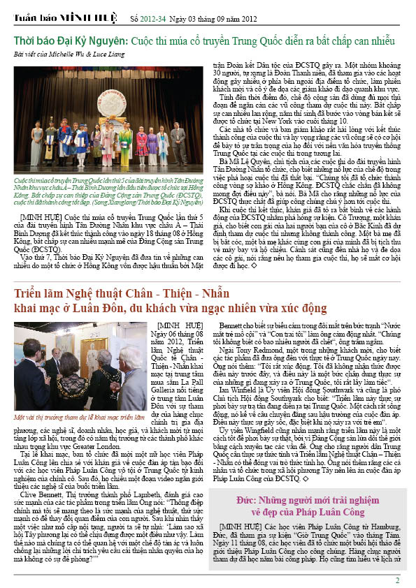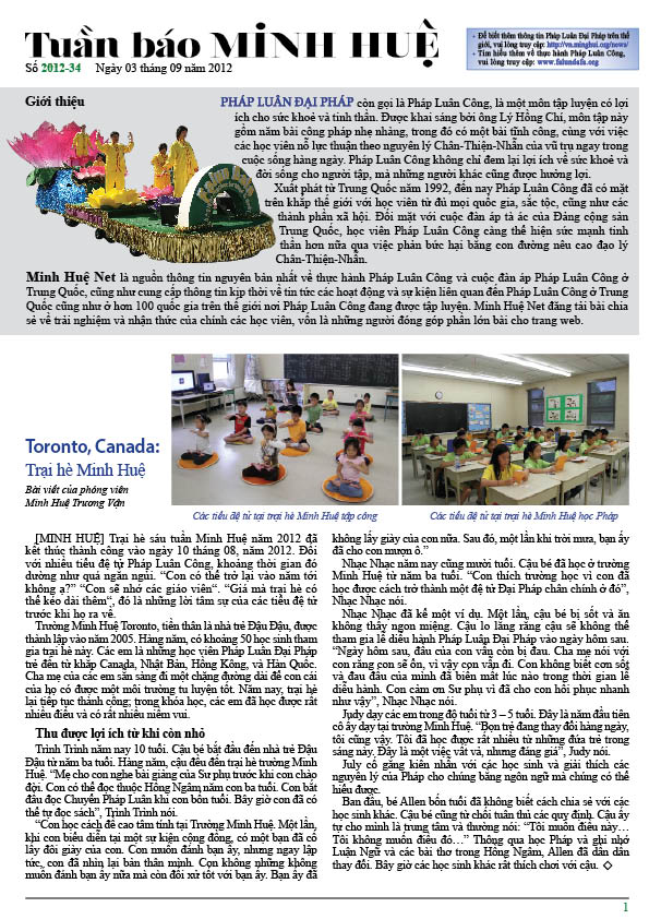 [MINH HUỆ 03-09-2012]Tuần báo Minh Huệ tổng hợp tin tức hàng tuần về cuộc đàn áp ở Trung Quốc và các sự kiện của học viên Pháp Luân Công trên khắp thế giới, với dạng thức là bản in màu định dạng PDF, gồm 4 trang. Bản PDF này định dạng khổ A4 tiện dụng cho việc in ấn phổ thông.