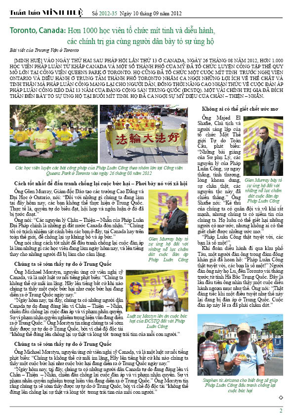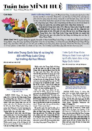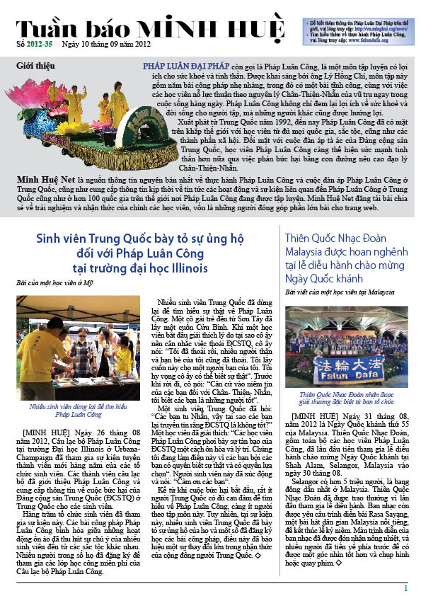 [MINH HUỆ 11-09-2012]Tuần báo Minh Huệ tổng hợp tin tức hàng tuần về cuộc đàn áp ở Trung Quốc và các sự kiện của học viên Pháp Luân Công trên khắp thế giới, với dạng thức là bản in màu định dạng PDF, gồm 4 trang. Bản PDF này định dạng khổ A4 tiện dụng cho việc in ấn phổ thông.