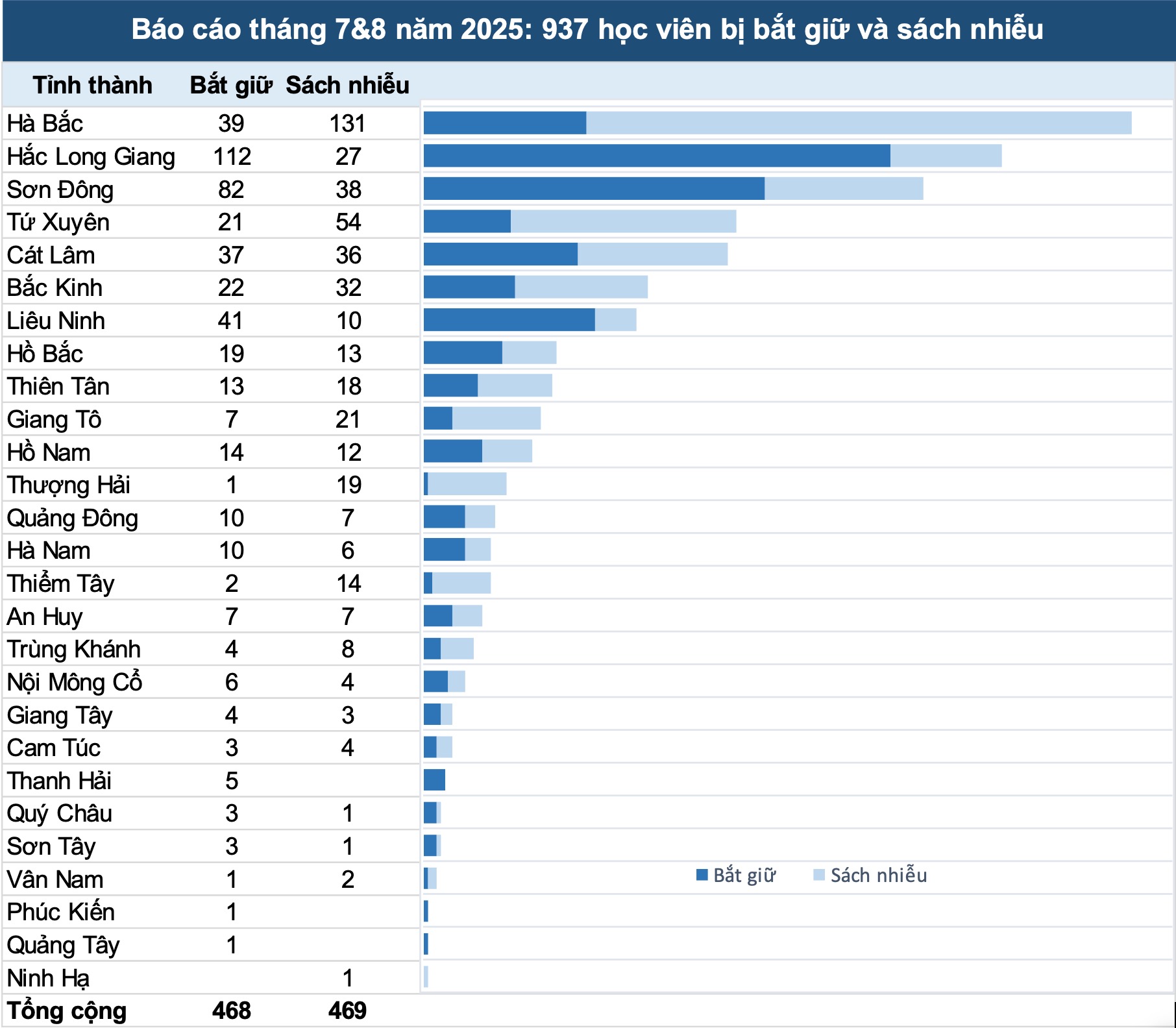 [MINH HUỆ 06-09-2025] Trong tháng 7 và tháng 8 năm 2025, tổng cộng có 937 trường hợp học viên Pháp Luân Công bị bắt giữ hoặc sách nhiễu vì đức tin được báo cáo.