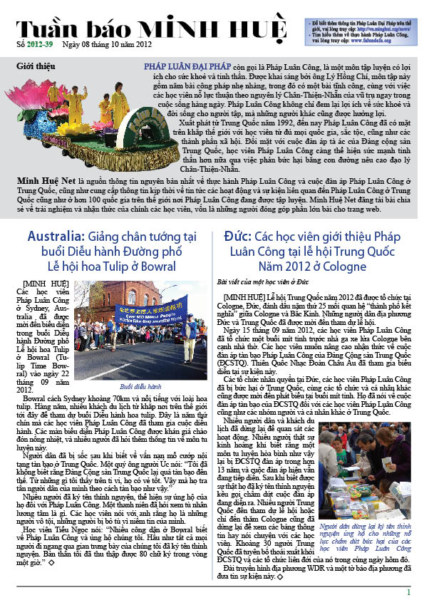 [MINH HUỆ 07-10-2012]Tuần báo Minh Huệ tổng hợp tin tức hàng tuần về cuộc đàn áp ở Trung Quốc và các sự kiện của học viên Pháp Luân Công trên khắp thế giới, với dạng thức là bản in màu định dạng PDF, gồm 4 trang. Bản PDF này định dạng khổ A4 tiện dụng cho việc in ấn phổ thông.