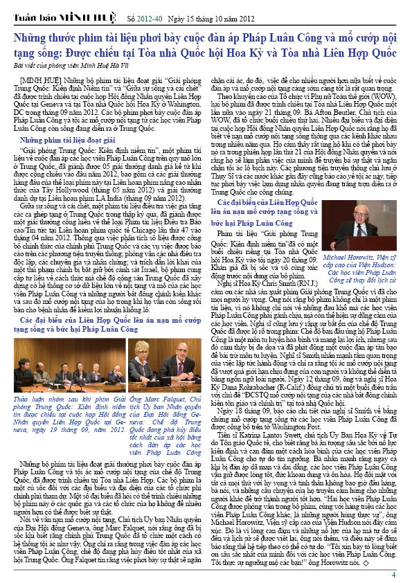 [MINH HUỆ 16-10-2012]Tuần báo Minh Huệ tổng hợp tin tức hàng tuần về cuộc đàn áp ở Trung Quốc và các sự kiện của học viên Pháp Luân Công trên khắp thế giới, với dạng thức là bản in màu định dạng PDF, gồm 4 trang. Bản PDF này định dạng khổ A4 tiện dụng cho việc in ấn phổ thông.
