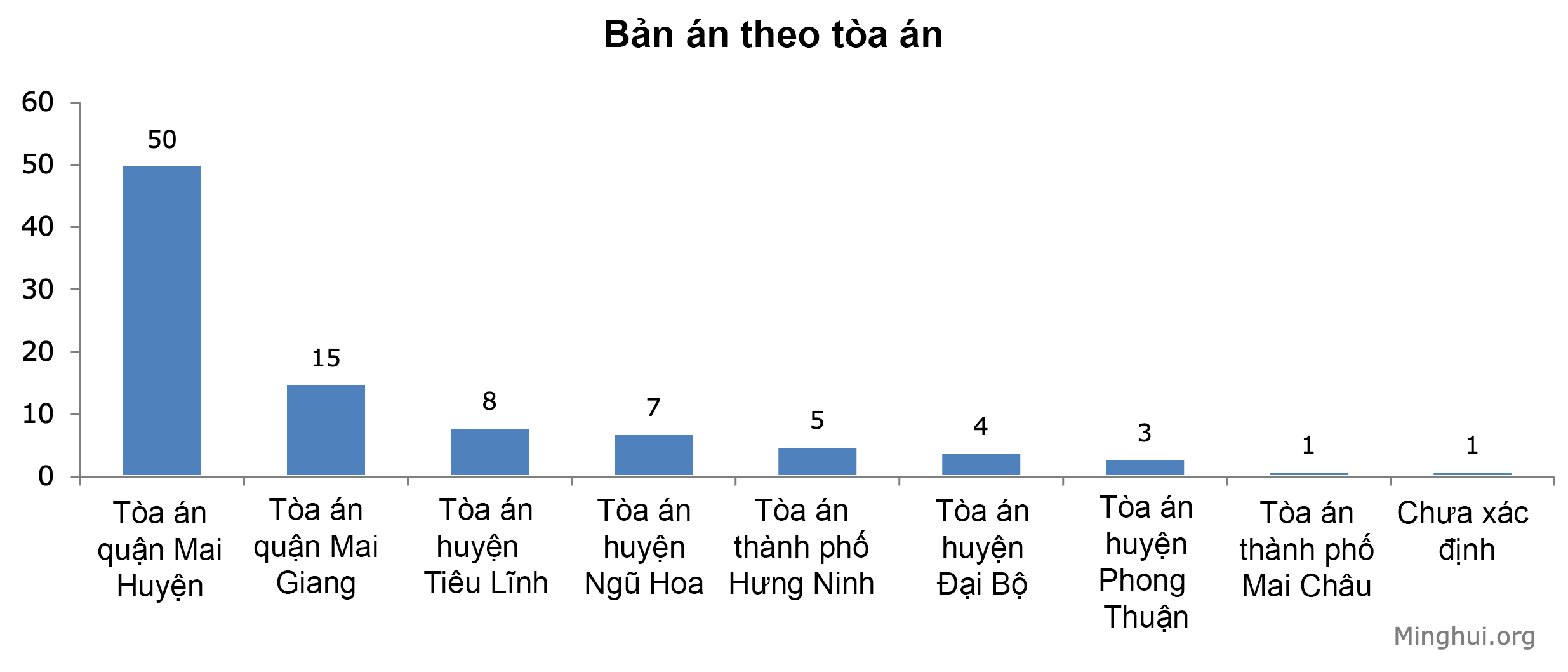 Các án tù (tổng cộng có 94 bản án, với 16 học viên bị kết án 2 lần) do 8 tòa án địa phương ban hành phán quyết: Tòa án quận Mai Huyện, Tòa án quận Mai Giang, Tòa án huyện Tiêu Lĩnh, Tòa án huyện Ngũ Hoa, Tòa án thành phố Hưng Ninh, Tòa án huyện Đại Bộ, Tòa án huyện Phong Thuận và Tòa án thành phố Mai Châu.