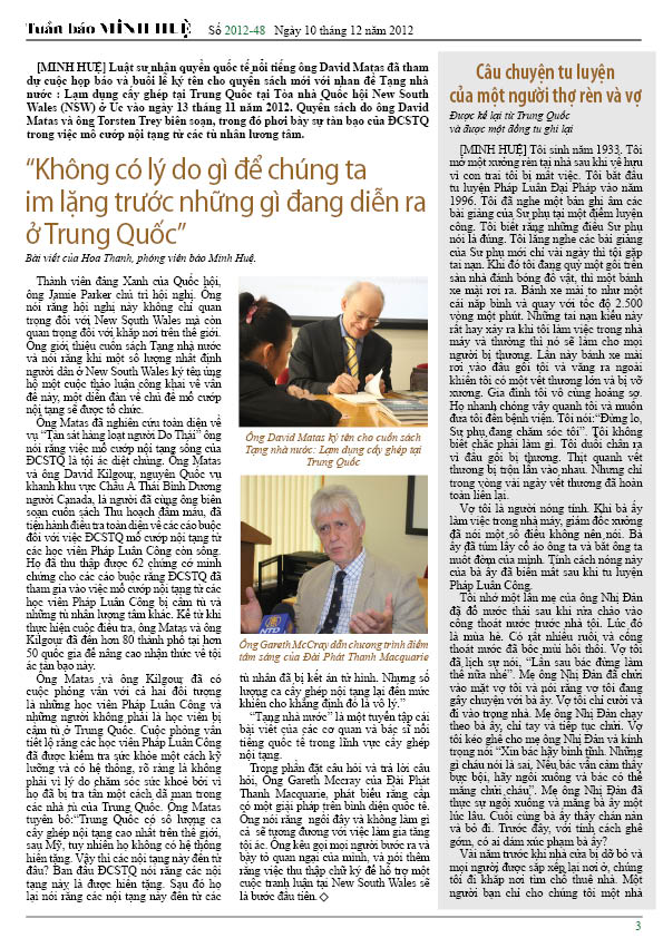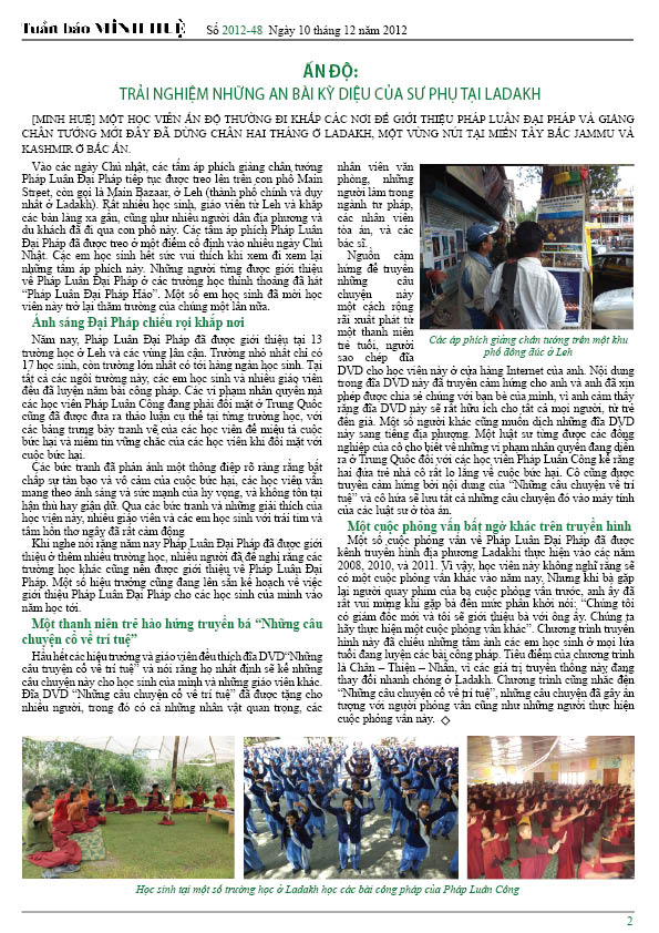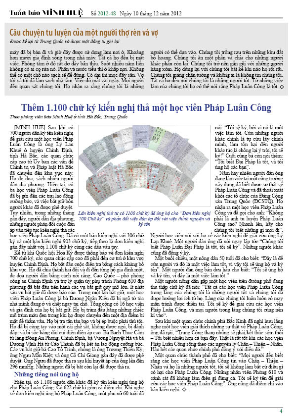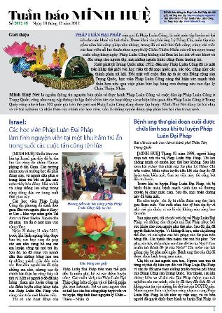 [MINH HUỆ 12-12-2012]Tuần báo Minh Huệ tổng hợp tin tức hàng tuần về cuộc đàn áp ở Trung Quốc và các sự kiện của học viên Pháp Luân Công trên khắp thế giới, với dạng thức là bản in màu định dạng PDF, gồm 4 trang. Bản PDF này định dạng khổ A4 tiện dụng cho việc in ấn phổ thông.