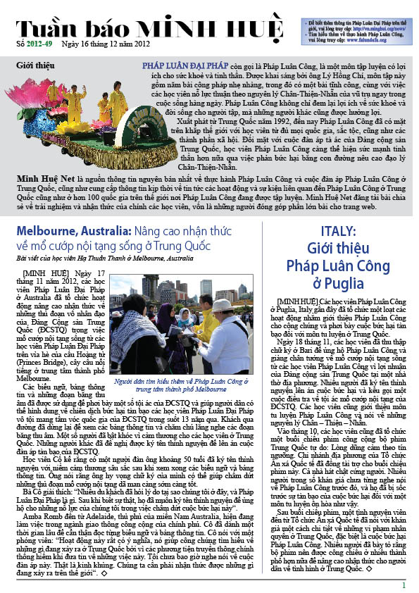 [MINH HUỆ 17-12-2012]Tuần báo Minh Huệ tổng hợp tin tức hàng tuần về cuộc đàn áp ở Trung Quốc và các sự kiện của học viên Pháp Luân Công trên khắp thế giới, với dạng thức là bản in màu định dạng PDF, gồm 4 trang. Bản PDF này định dạng khổ A4 tiện dụng cho việc in ấn phổ thông.
