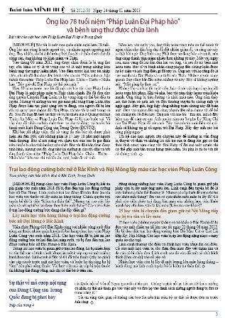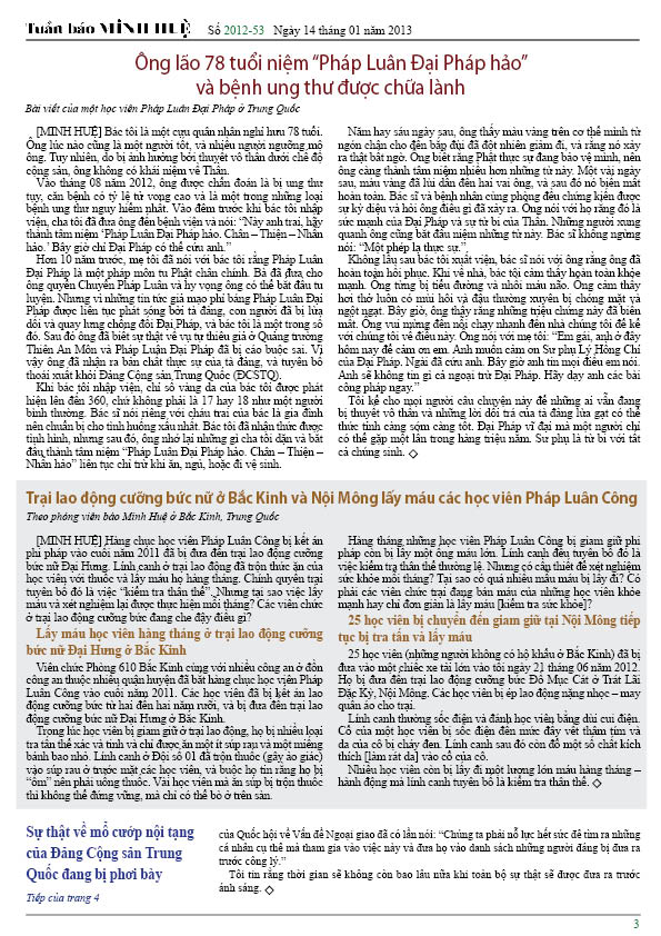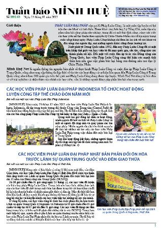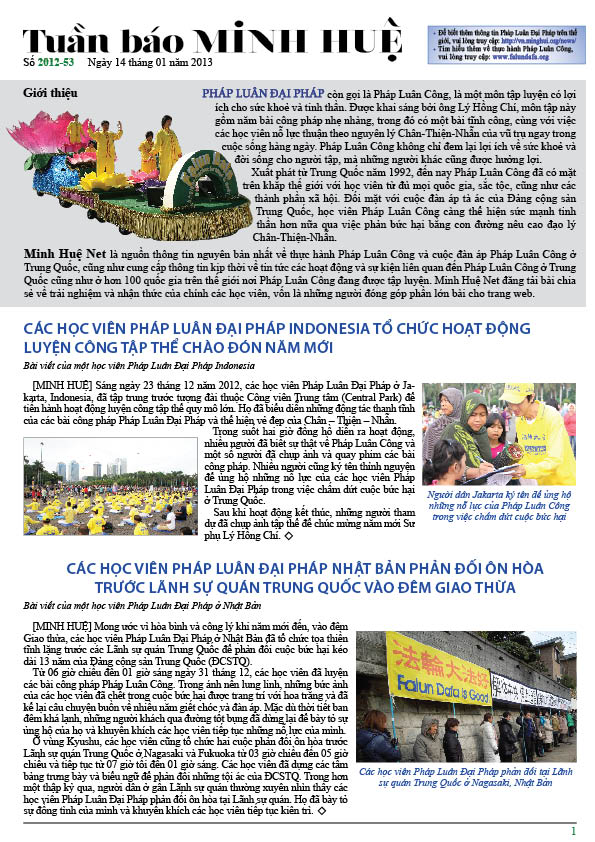 [MINH HUỆ 16-1-2013]Tuần báo Minh Huệ tổng hợp tin tức hàng tuần về cuộc đàn áp ở Trung Quốc và các sự kiện của học viên Pháp Luân Công trên khắp thế giới, với dạng thức là bản in màu định dạng PDF, gồm 4 trang. Bản PDF này định dạng khổ A4 tiện dụng cho việc in ấn phổ thông.