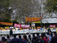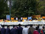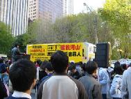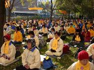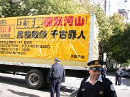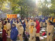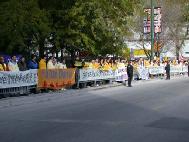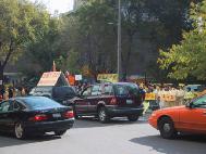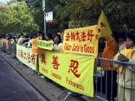 [Minh Huệ] Báo cáo từ Chicago: Vào lúc 11:25 sáng ngày 22 tháng 10 năm 2002, Giang Trạch Dân đến khách sạn Ritz-Carlton ở Chicago. Ðể tránh né hơn một ngàn đệ tử Pháp Luân Công đang biểu tình ôn hoà ngay trước cửa khách sạn, cùng với các nhóm biểu tình khác; đoàn xe của Giang Trạch Dân phải đi vào khách sạn từ bãi đậu xe. Mặc dầu Lãnh sự quán Trung quốc giàn xếp khoảng 400 người “dàn chào” từ các trường đại học ở Chicago, họ đã không thể che khuất hết những biểu ngữ như: “Pháp Luân Ðại Pháp hảo”, và “Chấm dứt đàn áp Pháp Luân Công”. Người ta có thể nhìn thấy những bộ y phục màu vàng của các đệ tử Ðại Pháp khắp mọi nơi.