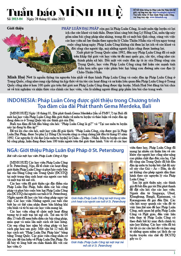 [MINH HUỆ 28-1-2013]Tuần báo Minh Huệ tổng hợp tin tức hàng tuần về cuộc đàn áp ở Trung Quốc và các sự kiện của học viên Pháp Luân Công trên khắp thế giới, với dạng thức là bản in màu định dạng PDF, gồm 4 trang. Bản PDF này định dạng khổ A4 tiện dụng cho việc in ấn phổ thông.