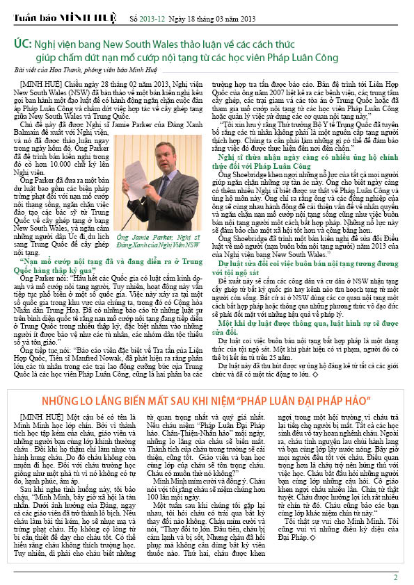 - Úc: Nghị viện bang New South Wales thảo luận về các cách thức giúp chấm dứt nạn mổ cướp nội tạng từ các học viên Pháp Luân Công