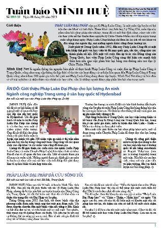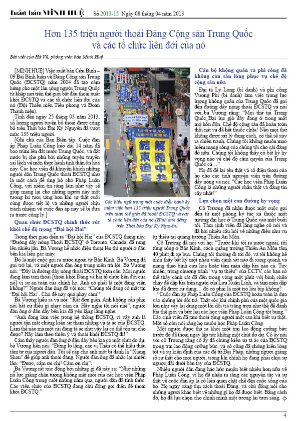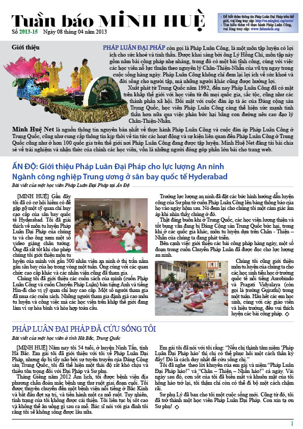 [MINH HUỆ 08-04-2013]Tuần báo Minh Huệ tổng hợp tin tức hàng tuần về cuộc đàn áp ở Trung Quốc và các sự kiện của học viên Pháp Luân Công trên khắp thế giới, với dạng thức là bản in màu định dạng PDF, gồm 4 trang. Bản PDF này định dạng khổ A4 tiện dụng cho việc in ấn phổ thông.