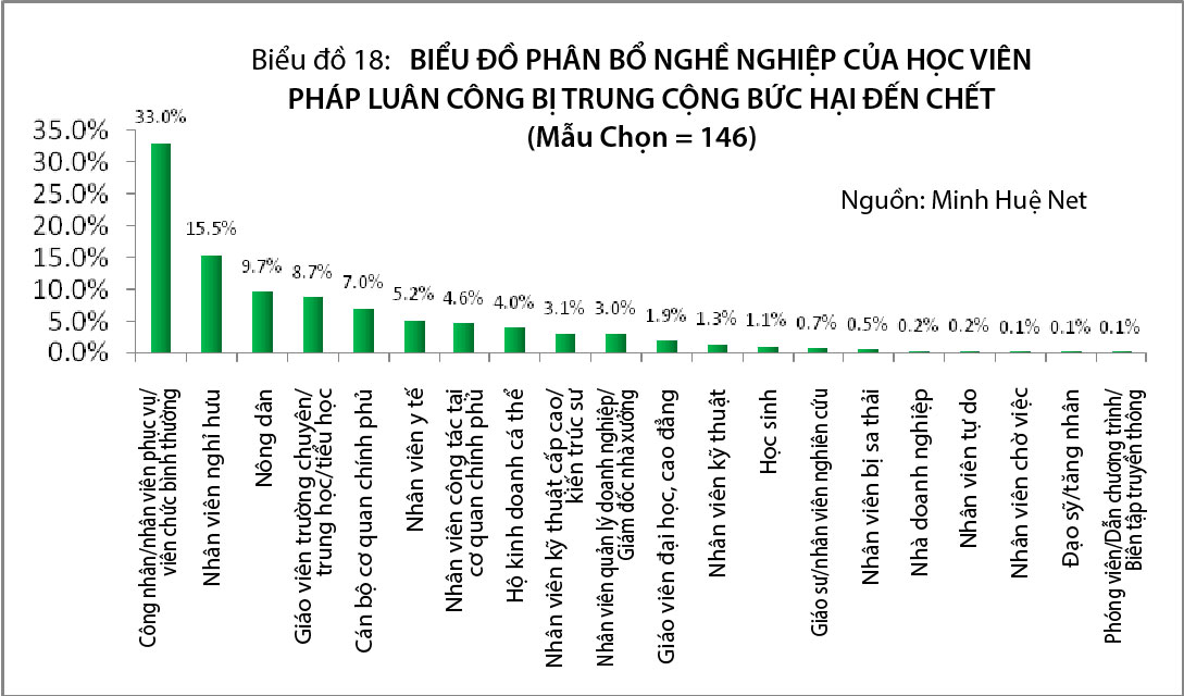 ĐCSTQ bức hại toàn diện học viên Pháp Luân Công, không chỉ là ở khắp nơi trên Đại lục, mà còn ở tất cả ngành nghề và nghề nghiệp. Trong số 3.653 trường hợp học viên Pháp Luân Công bị bức hại đến chết trong báo cáo này, chúng tôi thống kê có 1468 trường hợp có ghi chép về nghề nghiệp của học viên, kết quả thống kê ở biểu đồ 18 cho thấy, 33% là công nhân/nhân viên phục vụ/công chức bình thường, 15.5% là nhân viên nghỉ hưu, 9.7% là nông dân, 8.7% là giáo viên trung học, tiểu học, 7% là cán bộ các cơ quan chính phủ, 5.2% là nhân viên y tế, 4.6% là nhân viên công tác tại cơ quan chính phủ, 4% là hộ cá thể, còn có kiến trúc sư, tiểu thương, nhân viên quản lý doanh nghiệp, giáo sư đại học, học sinh, giáo sư, nhà doanh nghiệp, công nhân bị sa thải, người làm nghề tự do, đạo sỹ, tăng nhân, dẫn chương trình, v.v. Có thể nói là bao gồm tất cả các ngành nghề tại Trung Quốc.