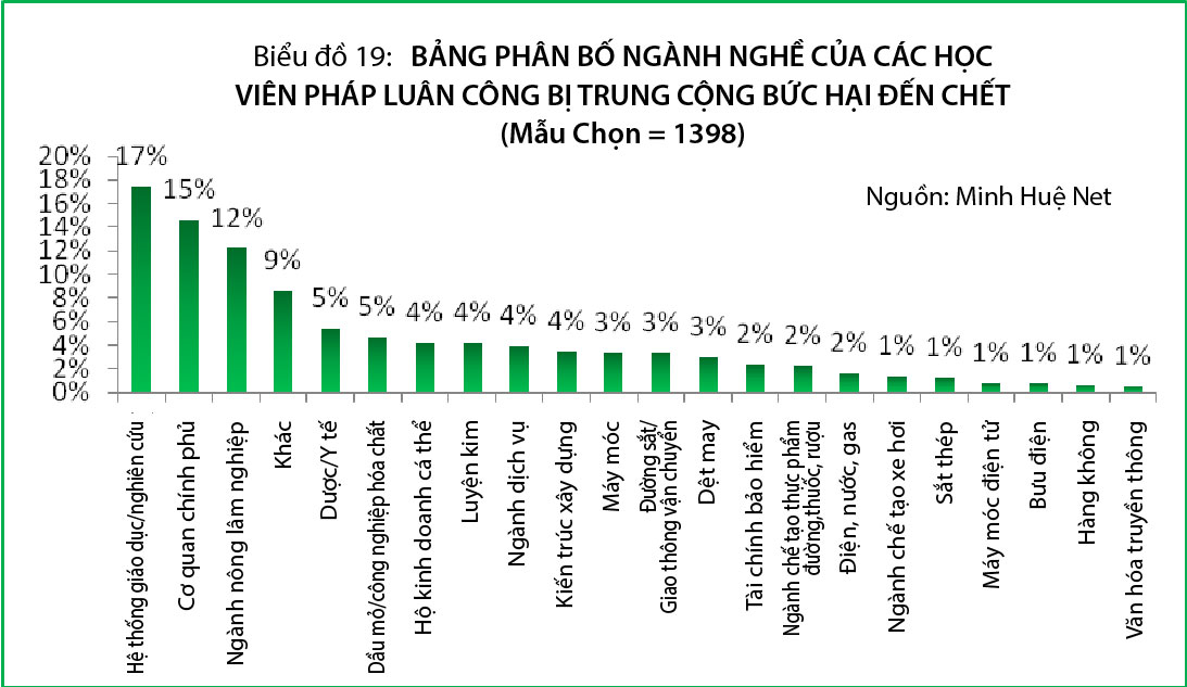 Trong số 1.468 tình huống có nghề nghiệp, chúng tôi thống kê 1.398 trường hợp có ghi chép được đơn vị công tác của học viên (biểu đồ 19), trong đó, 244 học viên (17%) bị bức hại đến chết công tác trong hệ thống giáo dục/nghiên cứu khoa học, 204 (15%) học viên bị bức hại đến chết công tác tại cơ quan chính phủ, 171 (12%) học viên Pháp Luân Công bị bức hại đến chết làm nghề trồng trọt chăn nuôi, 9% là ngành công nghiệp ngũ kim, giao thông điện tử, công nghiệp nhẹ, gốm sứ, nhựa, thủ công mỹ nghệ, 5% là ngành y dược, 5% là ngành chế tạo hóa dầu, còn có các hộ kinh doanh cá thể (4%), luyện kim (4%), ngành dịch vụ (4%), ngành vật liệu xây dựng (4%), ngành chế tạo máy (3%), đường sắt/giao thông vận chuyển, dệt may, tài chính bảo hiểm, thực phẩm phụ như đường, thuốc lá, rượu, điện, nước, than, chế tạo xe hơi, sắt thép, điện tử, bưu điện, truyền thông văn hóa, thậm chí còn có cả ngành hàng không. Có thể nói là hầu như bao gồm tất cả các ngành nghề tại Trung Quốc.