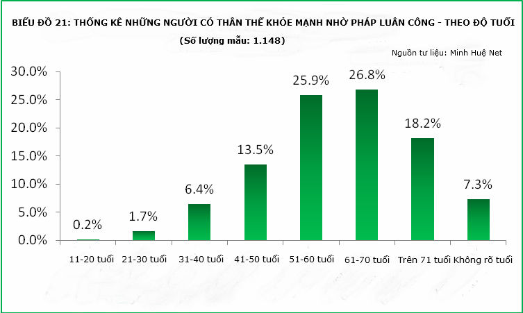 8% học viên trước khi tu luyện Pháp Luân Công thường đau ốm, hoặc từ nhỏ cơ thể ốm yếu nhiều bệnh, sau khi tu luyện Pháp Luân Công đã có được sức khỏe tốt, từ đó không bao giờ phải uống hay tiêm thuốc.