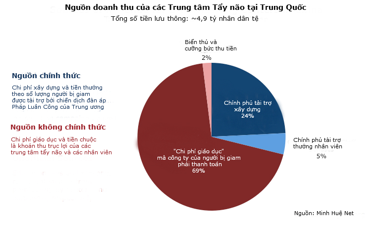 Chúng tôi ước tính rằng trong 15 năm qua, các chi phí phạt các doanh nghiệp có thuê các nhân viên là học viên Pháp Luân Công bị giam giữ tổng cộng đã lên đến gần 3,37 tỷ nhân dân tệ. Các khoản tiền thưởng của chính phủ cho việc “chuyển hóa thành công” cũng đã mang lại hơn 226 triệu nhân dân tệ. Đó là chưa kể đến 1,18 tỷ nhân dân tệ dành cho việc xây dựng và tu sửa các cơ sở tẩy não.