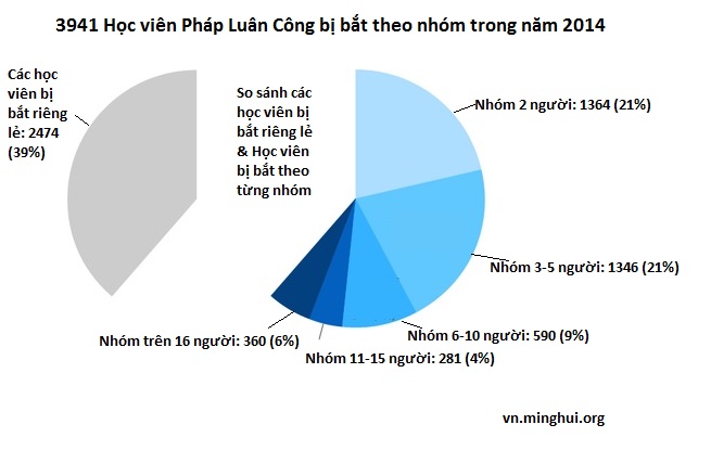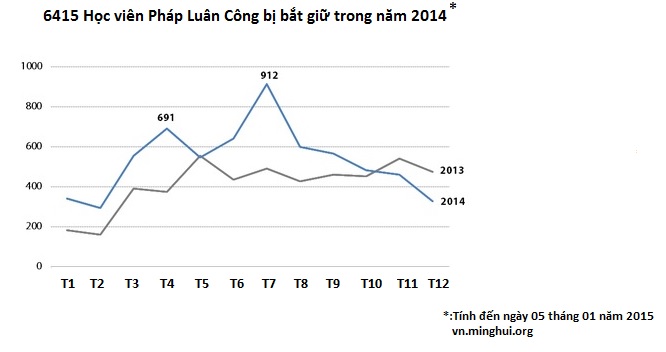 So với 4.942 người bị bắt (đã được xác nhận) trong năm 2013, thì năm 2014 có 6.415 học viên bị công an bắt giữ bởi đức tin của họ, và trung bình mỗi ngày có 18 học viên bị bắt giữ.