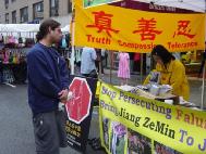Tôi phân phát tài liệu cho mọi người và cũng mở máy thu băng cho những bài như “Phổ độ” và Tế thế”. Một số người ký tên vào bảng thỉnh nguyện chấm dứt chính sách khủng bố và ủng hộ Pháp Luân Công sau khi họ đọc những tài liệu đang trưng bày và lời giải thích của tôi. Một số hỏi tôi nếu chúng tôi cần tiền ủy lạo. Tôi nói với họ chúng tôi không nhận tiền ủy lạo. Chúng tôi chỉ muốn nói với họ về sự thật Pháp Luân Công.