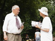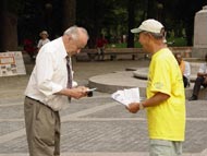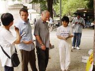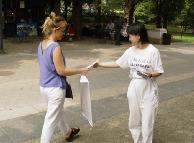 Một đệ tử khác và tôi rời nhóm trong giây lát và đi đến một chỗ khác rất xa với địa điểm hiện tại. Chúng tôi phân phát tài liệu ỏ đó, nhưng hiệu quả không cao như ở địa điểm củ. Người ở đó hình như không để ý gì chúng tôi và rất tách rời chúng tôi. Vì thế chúng tôi đi trở vế lại. Trong khi một số chúng tôi đang tập Công Pháp, một số phân phát tài liệu, và kết quả rất là tốt. Chúng tôi tìm tất cả các cơ hội để tiếp xúc với họ. Khi họ lắng nghe chúng tôi, họ cũng một phần biết được Pháp Luân Công là gì khi thấy các đệ tử khác đang tập Công Pháp, hay nhìn vào những tấm tài liệu mà chúng tôi đang trưng bày. Khi chúng tôi nói với họ về chính sách khủng bố, họ liền nhận tài liệu và đọc kỹ. Cách này có kết quả nhất.
