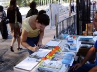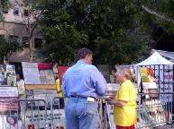 Một đệ tử đến từ Anh quốc đang phân phát báo chí Pháp Luân Công