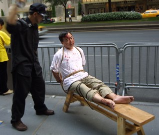 Vào khoảng 4 giờ chiều, khi tôi đang đứng trên góc đường 49 và Park avenue, một đệ tử tên là Julies, đến nói với tôi. “Bạn có muốn gia nhập vào toán chúng tôi không? Tôi sẽ trang điểm cho bạn và bạn sẽ ngồi trên Ghế Cọp cho hoạt cảnh chống tra tấn.”. “Vậy sao?” tôi trả lời và đi theo chị ta. Sau đó 15 phút, tôi được trang điểm thành một đệ tử bị tra tấn ngồi trên Ghế Cọp. Ngay phút đầu tiên trên Ghế Cọp, nước mắt tôi tuôn trào ra. Tôi không điều khiển chúng được nữa. Tôi nghĩ đến những đệ tử tại Trung quốc, đang chịu đựng nhiều khổ nạn, tra tấn, cực hình…và thậm chí ngay cả mạng sống của họ vì để trân quý Pháp mà họ đã đắc. Tôi ở đây, trên Ghế Cọp, chung quanh tôi là những đệ tử, cảm thấy được an toàn. Tự nhiên, tôi nhớ lại có nhiều lần tôi ngủ quên không phát Chính niệm lúc 6 giờ sáng. Tôi cảm thấy mình rất ích kỷ, rất nhỏ bé, giống như những hạt bụi so với các đệ tử tại Trung quốc. Nước mắt vẫn chảy dài trên má. Sau đó tôi nghĩ về những người dân Nữu ước. Họ biết gì về Pháp Luân Công, về chính sách khủng bố Pháp Luân Công? Đời sống hàng ngày của họ chỉ toàn là nghĩ về vật chất. Họ chỉ lo cho địa vị của họ, họ ăn diện như thế nào, họ ăn uống ở nhà hàng nào… tất cả là vật chất. Tôi cảm thấy sự hiện diện của các đệ tử và tôi ở Nữu ước rất tốt cho họ. Không phải chỉ riêng họ, mà còn tất cả nhân loại trên thế giới. Chúng tôi muốn cho họ hiểu rõ sự thật và giúp chúng ta chấm dứt chính sách khủng bố vô nhân đạo và vô nghĩa này. Không cần biết là phải hy sinh như thế nào. Tôi muốn cho họ biết cái này là Ghế Cọp, đây chỉ là một phần trăm của những gì các đệ tử tại Trung quốc đang gánh chịu. Khi tôi ngồi trên Ghế Cọp được 30 phút, một đệ tử đang đóng vai “công an” hỏi tôi “anh mệt chưa? Anh có muốn nghỉ giải lao một chút không?”. Tôi trả lời anh ta “Không mệt đâu, tôi có thể ngồi lâu hơn, đừng lo cho tôi”. Tôi ngồi thêm được 30 phút nữa, thì một đệ tử khác ra thay thế cho tôi. Mặt mày tôi vẫn còn nguyên đồ trang điểm và áo quần được trang điểm đầy máu me, tôi ngồi xuống đằng sau những tấm biểu ngữ và phát Chính niệm. Mười lăm phút sau, tôi bước ra, tôi muốn lên Ghế Cọp ngồi lại. Tôi nói với người đệ tử đang ngồi trên Ghế Cọp: “Tôi biết ngồi lâu khó chịu lắm, nhưng tôi chỉ được ở đây trong mấy ngày cuối tuần, tôi muốn ngồi càng lâu càng tốt, và chị giữ sức để ngồi trong mấy ngày trong tuần”. Lúc đầu chị hơi ngại, lo rằng tôi vẫn còn mệt, nhưng khi chị nhìn vào mắt tôi, chị đồng ý cho tôi ngồi thế chị.